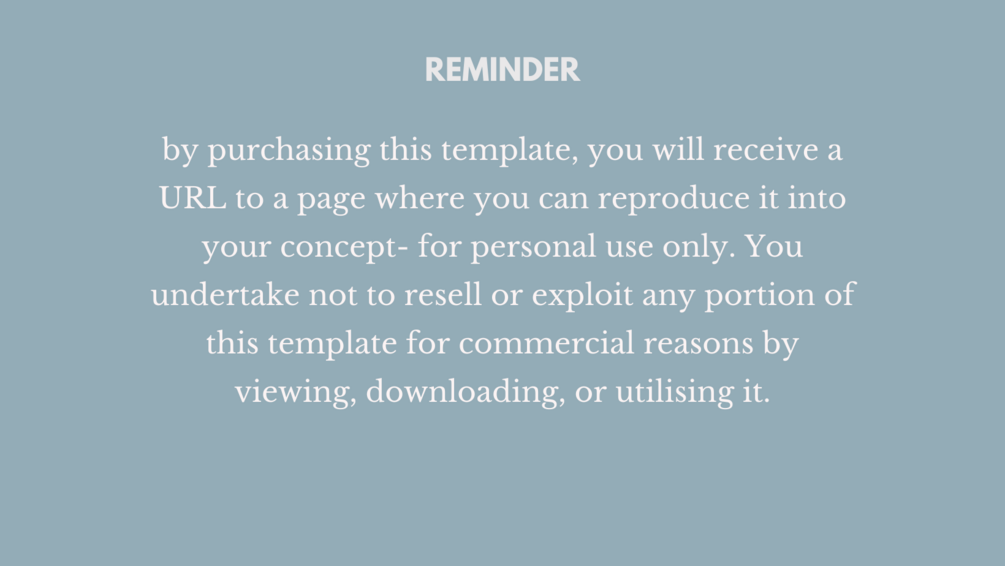 𝘕𝘖𝘛𝘌𝘚 by purchasing this template, you will receive a URL to a page to reproduce it into your concept, for personal use only. You undertake not to resell or exploit any portion of this template for commercial reasons by viewing, downloading, or utilizing it.